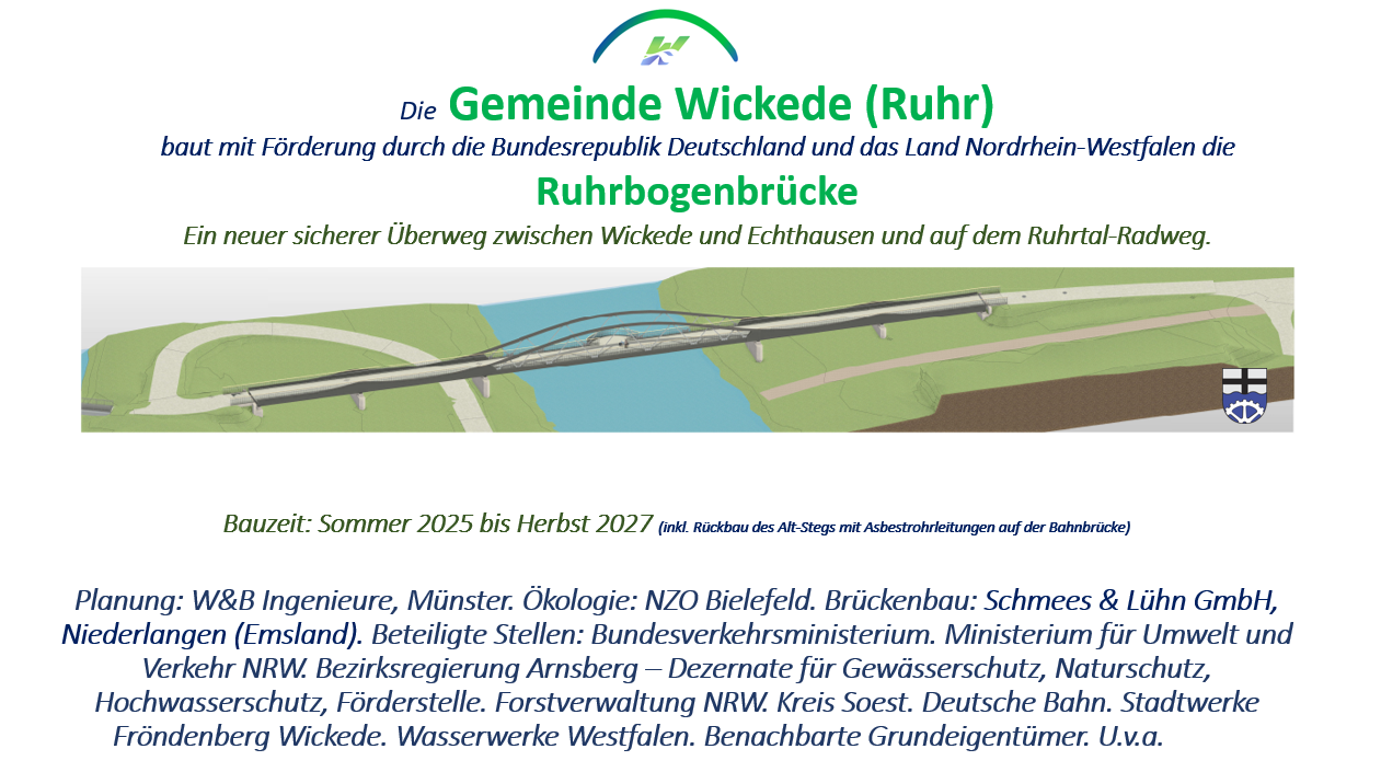 Das seit 125 Jahren aktive Unternehmen hat bisher über 3000 Brücken im In- und Ausland im Holz- und Stahlbau gebaut. Die vor drei Jahren neu errichteten, rund 13.000 m² großen Produktionshallen für die Herstellung und Sanierung von Fuß- und Radwegbrücken liegen direkt an der A31 in Niederlangen. Bauteile bis zu 60 Metern Länge und fünf Metern Breite, sowie mit einem Maximalgewicht von 80 Tonnen können als komplette Einzelstücke hergestellt oder saniert werden. So ist es auch für die Wickeder Ruhrbogenbrücke vorgesehen. Für die Tiefbauarbeiten, die bei Pfeilerfundamenten und Rampen anfallen, plant Schmees und Lühn die Zusammenarbeit mit einem heimischen Fachunternehmen, das bereits verlässlich Wickeder Baustellen bearbeitet hat. Bürgermeister Martin Michalzik informierte sich vor einigen Tagen persönlich vor Ort über die Leistungsfähigkeit des Anbieters. Sein Eindruck war positiv. In jüngster Zeit hat das Unternehmen u.a. in nur 100 Stunden eine entsprechend komplett vorgefertige Brücke über den Bahnhof von Zwolle in den Niederlanden gebaut. ,,Wir freuen uns auf Wickede, weil wir überzeugt sind, für das Projekt, die Planung und die damit verbundenen Herausforderungen wirklich gut aufgestellt zu sein“, so die Geschäftsführer Josef Schmees und Tobias Tebbe.