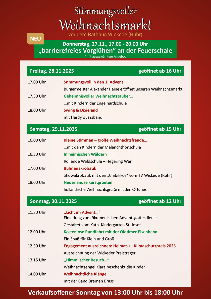 Den Beginn markiert das „barrierefreie Vorglühen“ an der Feuerschale, das von 17:00 bis 20:00 Uhr angeboten wird - ideal für alle, die sonst wegen des Bodenbelags Schwierigkeiten haben. Ein ausgewähltes Angebot sorgt für einen angenehmen Start in das Weihnachtsmarkt-Wochenende. Alle sind herzlich eingeladen, diesen besonderen Auftakt zu nutzen.