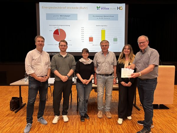 Wickedes Wärmeplanung läuft: Für Fachleute der Horizonte-Group GmbH stellten Oliver Kisignacz und Louis Göllner die ersten Ergebnisse vor. Stephanie Lebuser und Ludger Böhmer wirken auf Rathausseite mit. Kristin Arens von Netzwerk „Sanieren mit Zukunft“ im Kreis Soest ist Ansprechpartnerin für Hausbesitzer. Bürgermeister Michalzik moderierte die Veranstaltung.